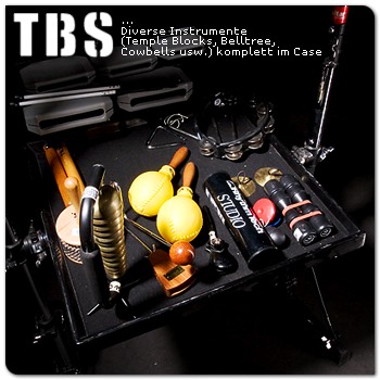 Diverse Instrumente (Temple Blocks, Belltree, Cowbells usw.) komplett im Case